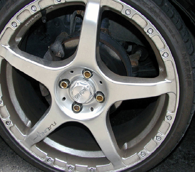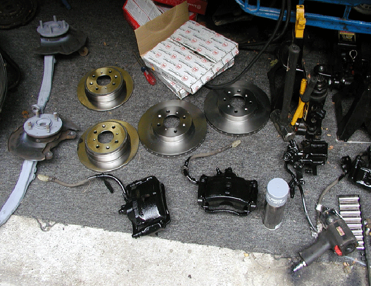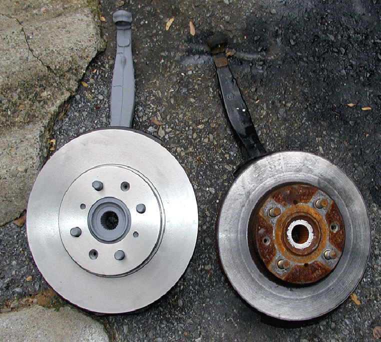 Here is a picture of the new spindles and rotors for my car and the old ones from it. Notice the surface area differance. I sprayed the spindles and hubs so the wouldn't rust.