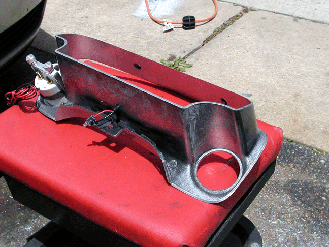 This trim piece came as a solid black plastic trim bezel. I wanted it to match the rest of the redone interior of the car. So I once again prepared it with primer, sprayed it with chrome paint, then sprayed it with the paint diffuser.