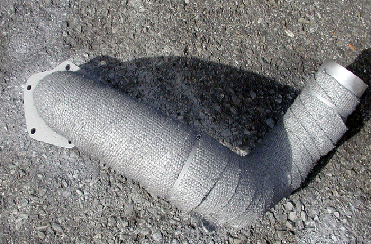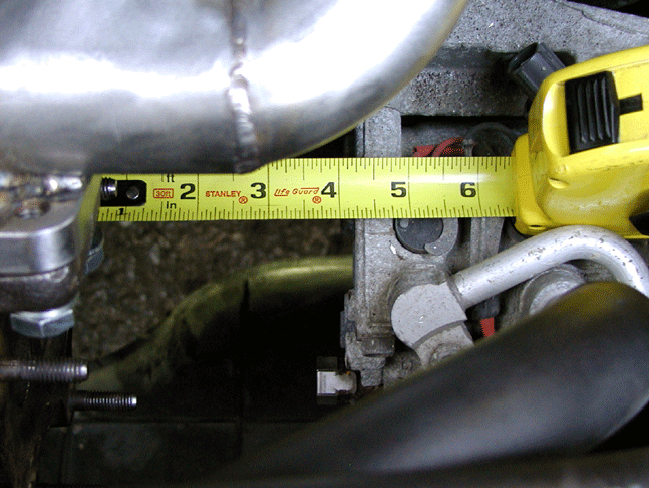 I made a stainless steel downpipe to use for the turbo that will fit in the space left between the turbo and the a/c compressor. This area is very tight for the 2.5" pipe, but I got it to fit with no problems..