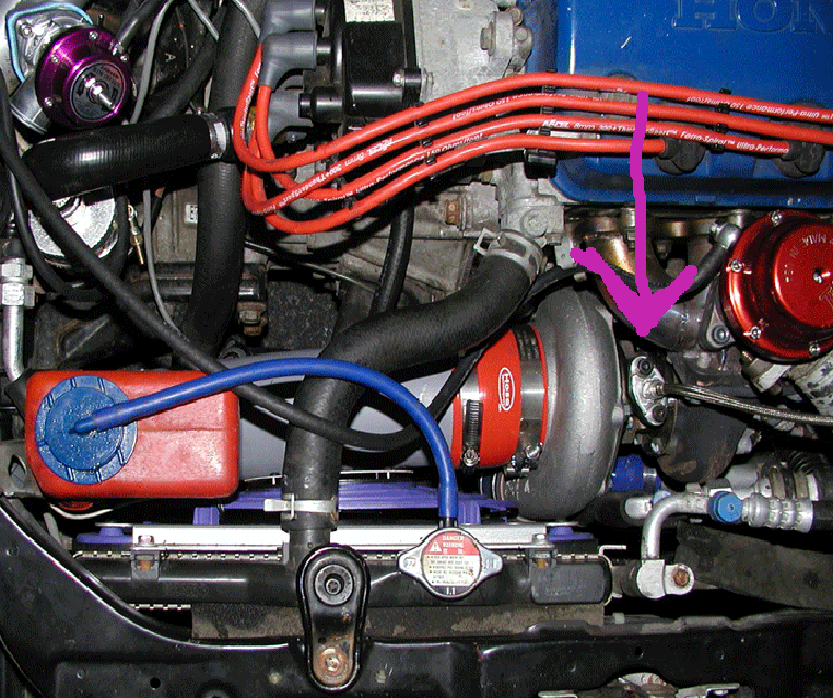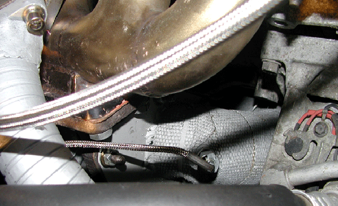 I installed my EGT right as the downpipe starts to bend down from the turbo.. It ended up being 2 1/4 inches from the rear turbine wheel.. The braided line going across the middle of the above pic is the oil feed line for the turbo.