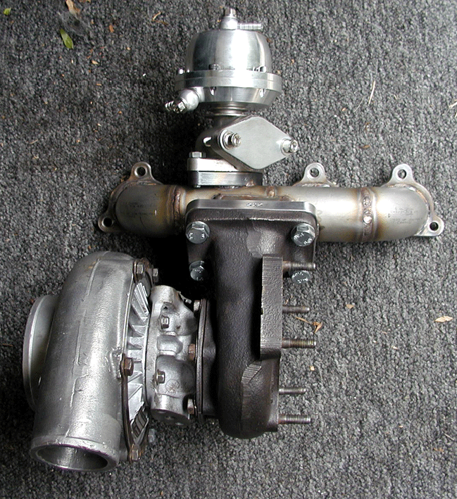 These are pictures of my X-turbo and Wastegate mounted to my Log Style Exhaust Manifold. This turbo had a shitty rebuild apparently from http://www.blaastperformance.com who the original owner got it from and never used it since the rebuild.. I recommend not buying a turbo from them. We were gently and I am telling the true drove the car around to test it and the front turbine wheel came off the shaft, not because the nut came loose, but because it just broke off the shaft. As Ian and I drove back to the garage the rear turbine wheel was spinning with no drag against from the compressor side, it spun so fast while we were driving about 4000 rpms that the wheel broke off its' shaft and flew out my exhaust and landed in the middle of the road.. Three of the rear wheels fins went thru the rear turbine housing and oil flew out the exhaust like crazy.. Luckily I had a shut off on the oil supply line so we could drive the car home normally. So I had to get a new turbo... And a brand new one with no problems.. So I ordered a brand new T3/60-1 Garrett from www.cheapturbo.com and they shipped it overnight for a boy who can't wait.. I do recommend buying from them.