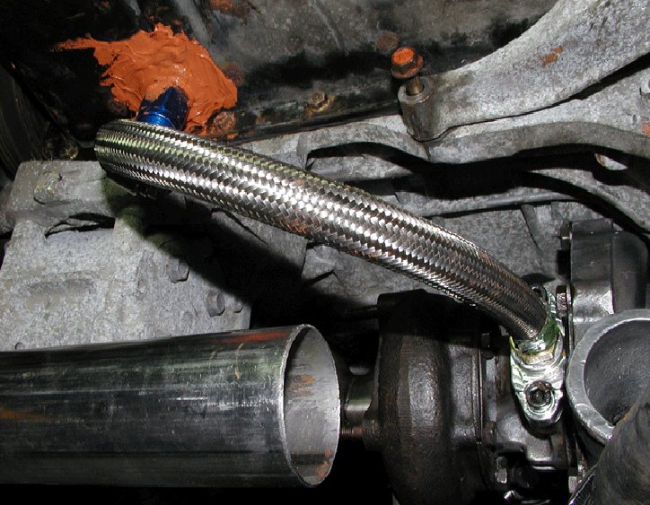 Here the finished product mounted to the car. The line comes off the turbo using gravity to dump back into the oil pan.